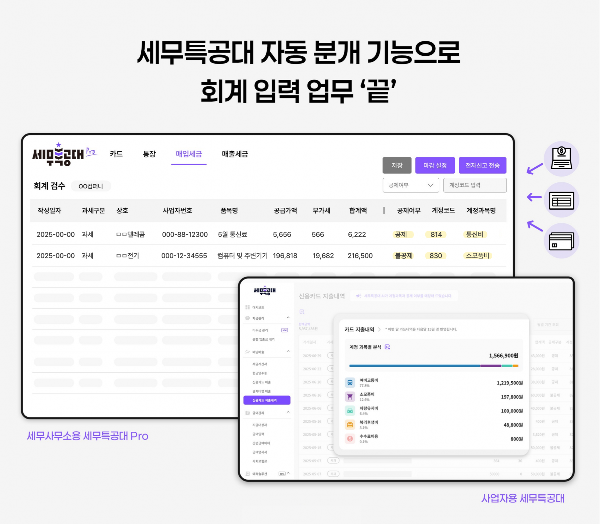 특히 세무사무소 전용 솔루션 ‘세무특공대 Pro’와 연동하여 회계·세무 전문가가 직접 회계 데이터의 자동 분개 내역을 확인·수정할 수 있어, 사업자와 세무사 간 협업 기반의 회계처리 정확성을 높입니다.